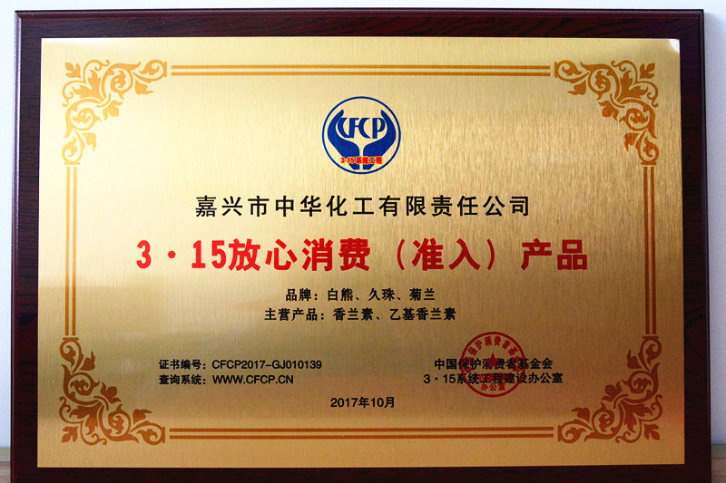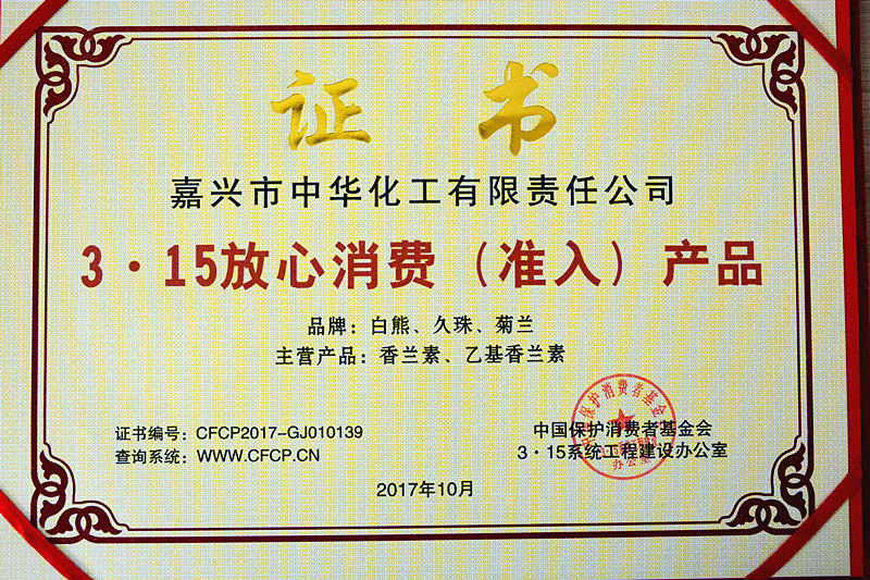 為貫徹落實(shí)黨和政府關(guān)于建立健全社會(huì)征信體系,褒揚(yáng)誠信,懲戒失信和建立營造良好的法制環(huán)境,增強(qiáng)社會(huì)消費(fèi)信心,中國保護(hù)消費(fèi)者基金會(huì)根據(jù)《消費(fèi)者權(quán)益保護(hù)法》所賦予消費(fèi)者組織的工作職能,開展了推進(jìn)3.15系統(tǒng)工程,發(fā)展維護(hù)消費(fèi)者權(quán)益“3.15誠信體系單位”征信“放心消費(fèi)(準(zhǔn)入)品牌/產(chǎn)品”專題活動(dòng)。在本次評(píng)選活動(dòng)中,我公司喜獲“3.15誠信體系單位”榮譽(yù)稱號(hào);白熊、久珠、菊蘭牌香蘭素、乙基香蘭素榮膺“放心消費(fèi)(準(zhǔn)入)品牌/產(chǎn)品”榮譽(yù)稱號(hào)。
