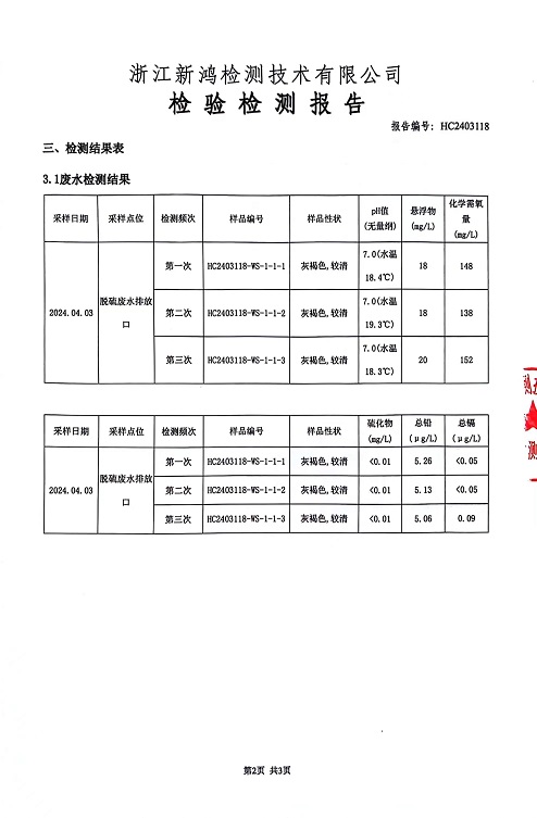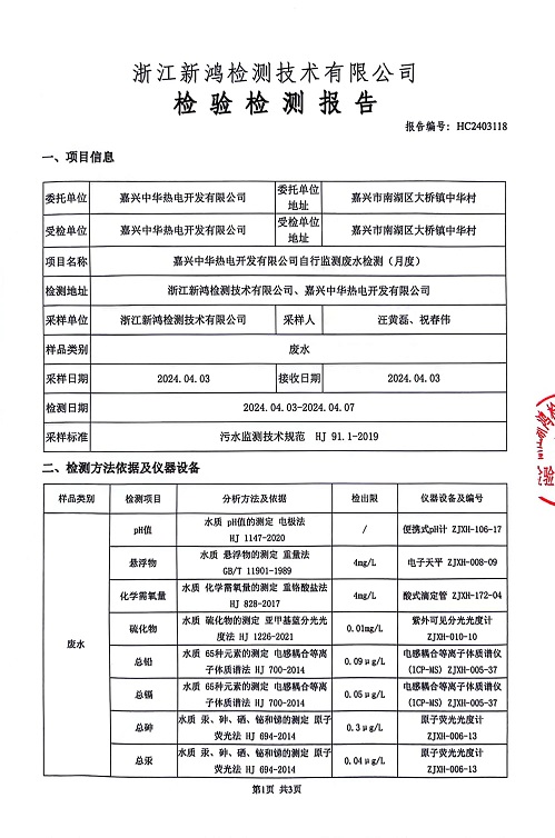 報(bào)告名稱:2024年中華熱電4月廢水檢測報(bào)告